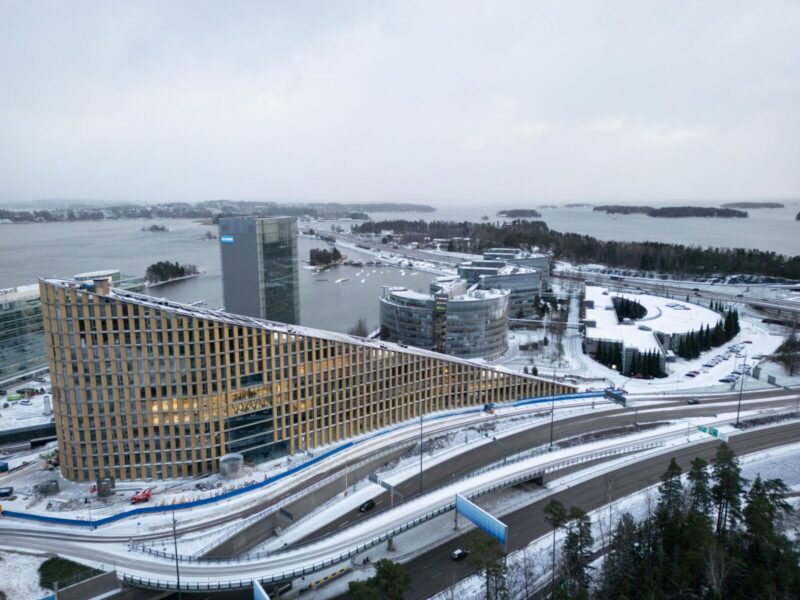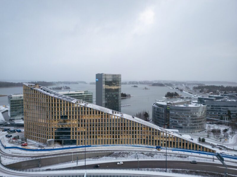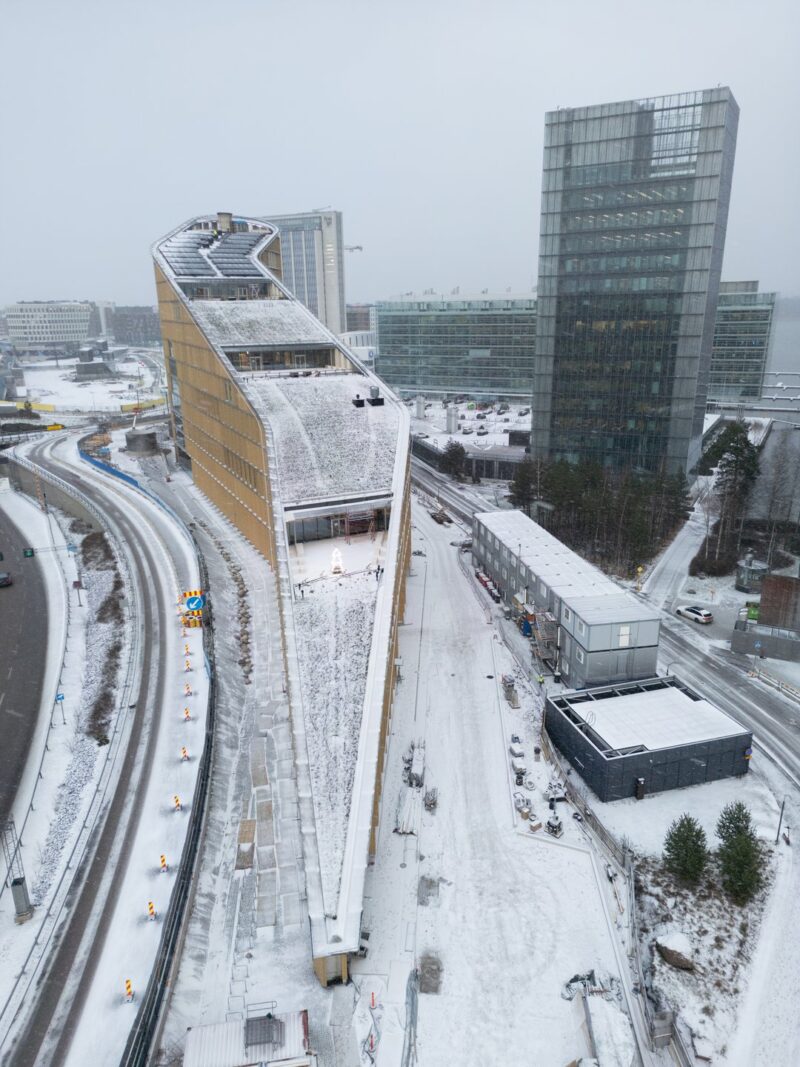Puurakenteinen, 14-kerroksinen toimitilarakennus kohoaa merelliseen ja kehittyvään Espoon Keilaniemeen. Kuvissa Keilaniemen Portti joulukuussa 2025.