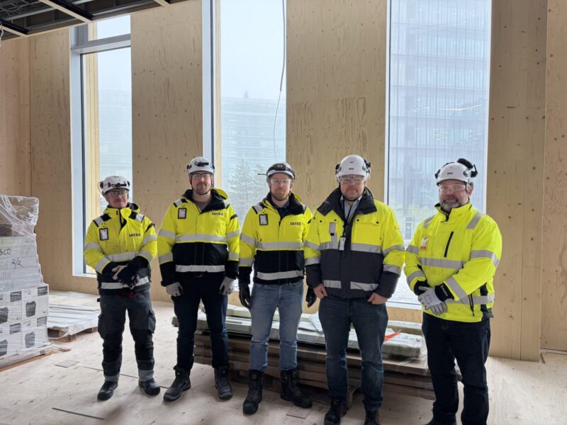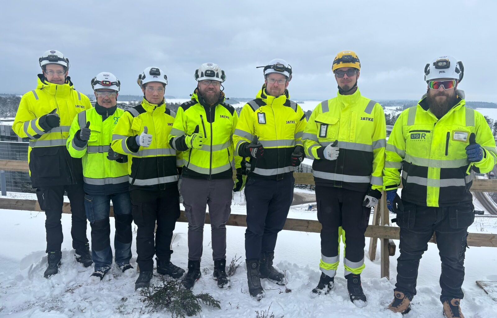 Kuvateksti: Kuvassa vasemmalta Jatkeen työnjohtaja Mikko Kauppila, siivoustöiden työnjohtaja Tero Vähänen (Loni Palvelut), Jatkeen työnjohtaja Ismo Saastamoinen, aluevastaava Jaakko Kinossalo, työmaapäällikkö Pekka Ruokonen, työsuojeluvaltuutettu Lauri Pekki ja logistiikkaurakoitsijan työnjohtaja Jyri Fatal (LTQ-rakennus).